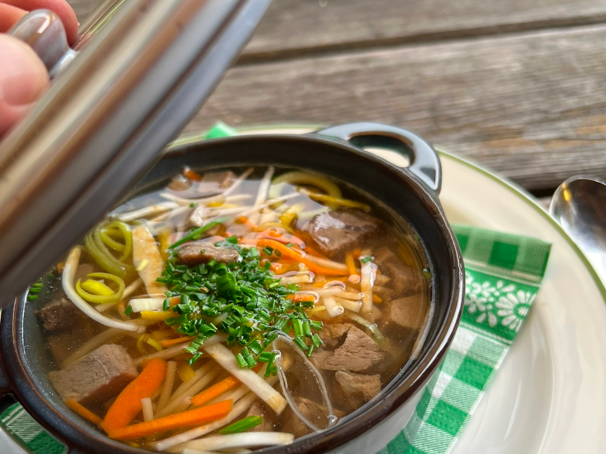 einem Bildband. Ich setze mich auf die Terrasse, ziehe die Wanderschuhe aus und genieße das kleine Glück: warme Sonne, frische Luft und die